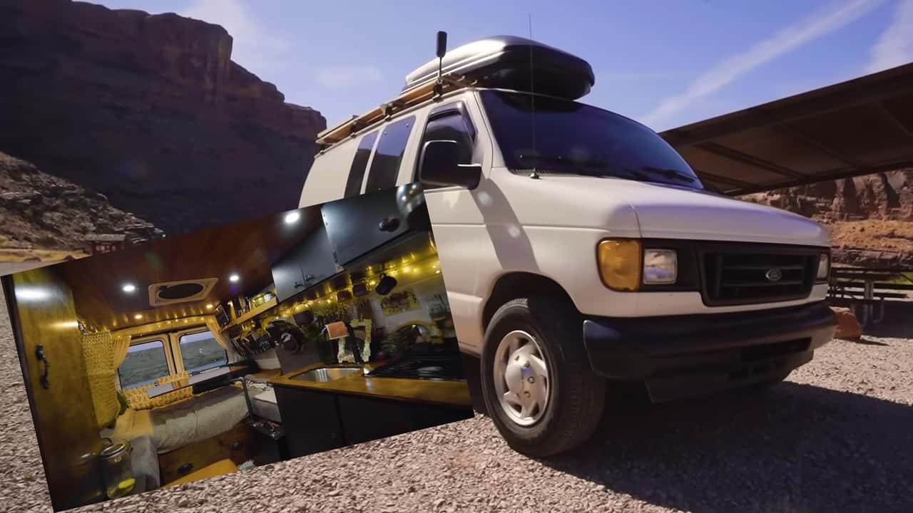 In the video, Kath confesses to liking antiques and locally sourced art. Oftentimes we see camper builds that emphasize function over aesthetics, so it’s nice to see something that actually looks like a home. Knick-knacks are placed around the stove, art is hanging off the walls, and the onboard electronics – a 100 amp-hour lithium-ion battery and a 1,000-watt inverter – are neatly stored beneath a rustic-themed bench seat.