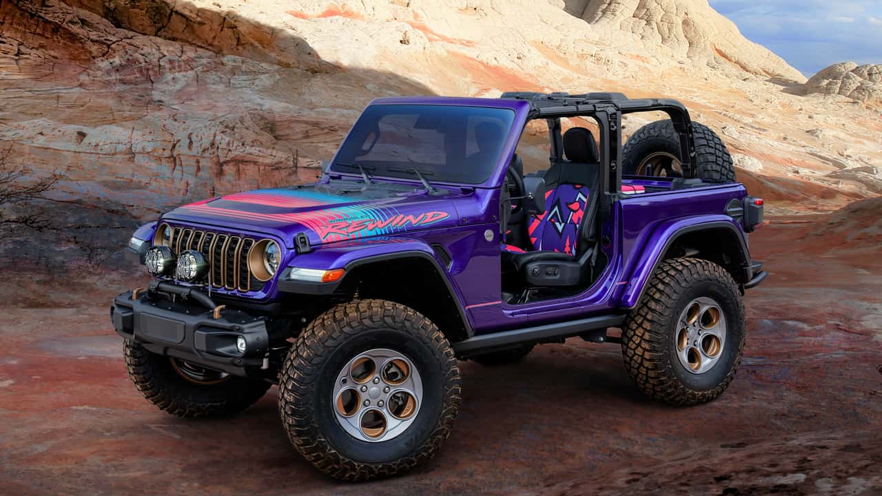 Jeep is playing to the ‘80s and ‘90s nostalgia of Gen X and elder Millenials with this two-door, door- and roof-less Wrangler. It’s painted Grimace Purple with colorful exterior graphics, with seat fabric straight out of the MTV era, and custom 17” phone-dial wheels from AEV.